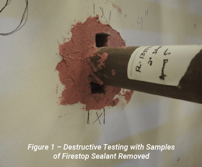 mishaps are perhaps the most common culprit that most people would think of as a potential source of damage to installed firestops. However, there is often a need to conduct destructive sampling tests of firestop materials to ensure compliance with the appropriate tested system. The thickness of the firestop material in this small specimen, which was obtained from destructive testing, is compared to a benchmark value to confirm the firestop has been properly installed. Both accidents and deliberate destructive testing can create a firestop system that needs to be repaired. Do we have to start from scratch and replace the entire existing firestop or is there an easier solution?