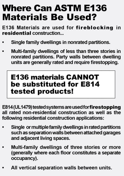 What is ASTM E136? Fireblocking predates actual through-penetration testing standards such as ASTM E814 or UL1479. In the absence of a specific test and in consideration that the construction itself is combustible (for the most part) and nonrated, the codes simply said ‘let’s stuff something into the openings that won’t burn”. A relatively simple and inexpensive test for noncombustibility (ASTM E136) was chosen as the test method. In this test, a material (just the material itself) is placed into a small tube furnace. The pass/fail criteria relates to how much weight the specimen loses and whether its fuel content raises the air temperature in the oven.