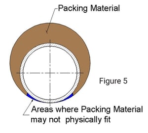 Any discussion on point contact will invariably trigger the discussion on packing materials. Some systems require a packing material as an integral component. A common packing material is mineral wool, although glass or ceramic fiber may also be used in some systems. To confirm, there is no packing material behind the penetrant at the point contact location. The packing material is often wedged up as close as possible to the sides of the penetrant where it contacts the periphery of the opening. In some cases, the prescribed depth of packing material at these locations may be less than specified in the system due to the physical limitations of hand-packing the material into said location. Additionally, when doing an inspection of the packing material prior to sealant installation, a void space may be observed (Figure 5). This small void space is covered with the sealant that is applied as a fillet bead atop it.