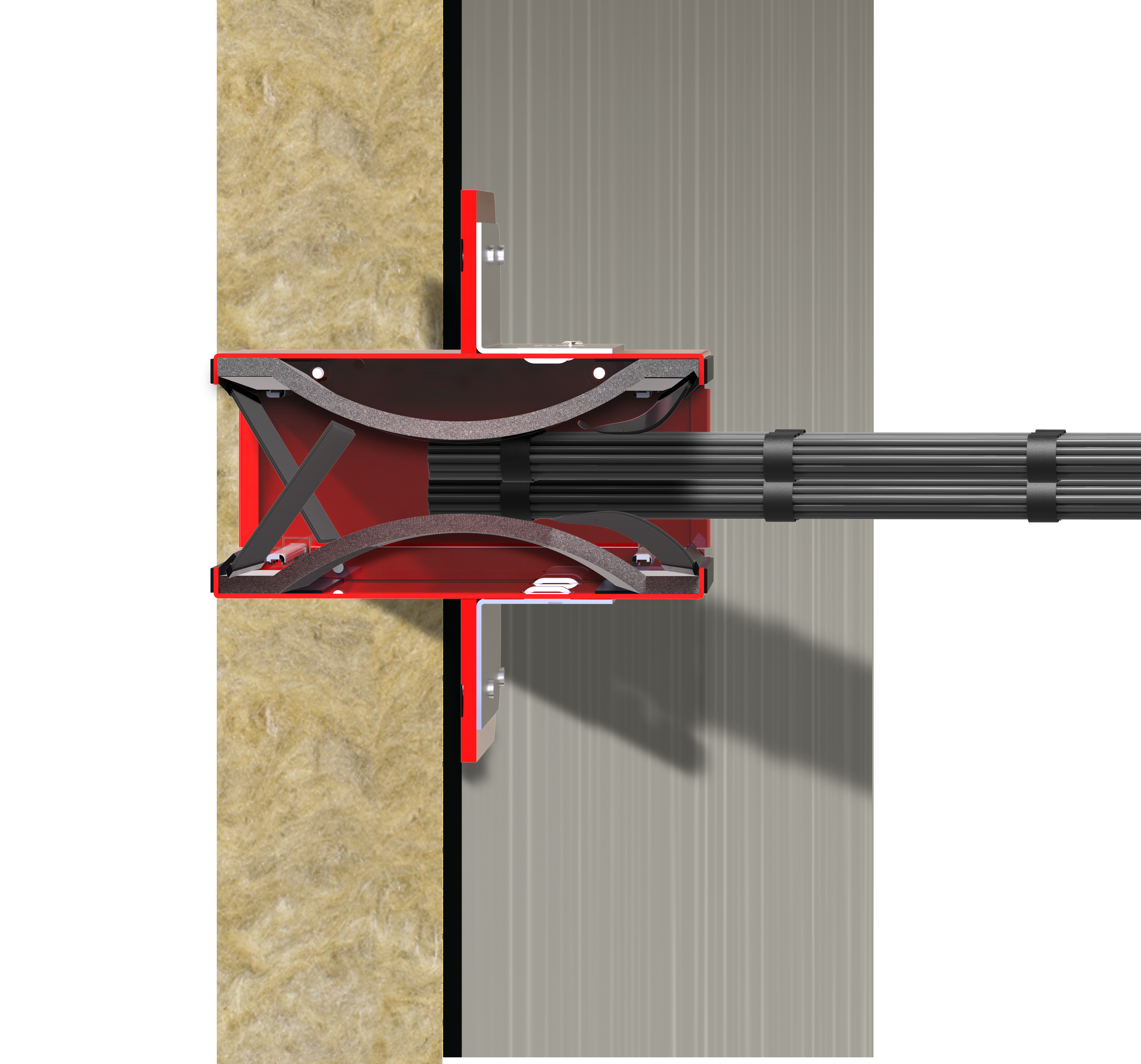O dispositivo de passagem de cabos consiste em um invólucro de aço de calibre pesado com revestimentos intumescentes autoajustáveis para permitir que os cabos