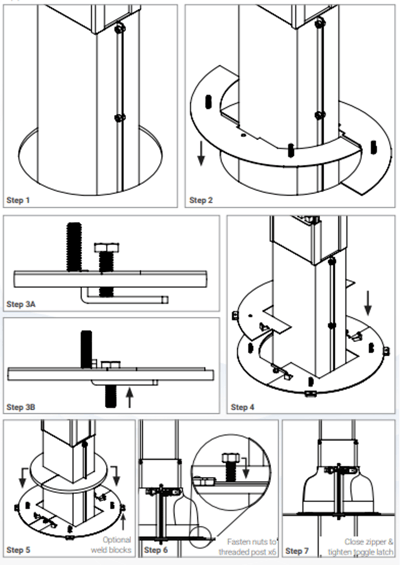 - Position the cover plates over the base plates, inserting the threaded studs through the holes in the cover plates. (Optional – Secure the cover plate to the division via tack welds at each of the four weld blocks.)
