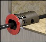 additional insulation, and also includes small diameter copper and PVC tubes. Installation is as simple as cutting a hole, pulling the penetrant, snapping the plug together, and pushing it through the opening. The plug automatically engages the division via pre-bent tabs on the side. Should ingress protection be necessary, Snap-Seal has been tested to IP66 with a thin application of MFS Sealant over the flange, as shown above.