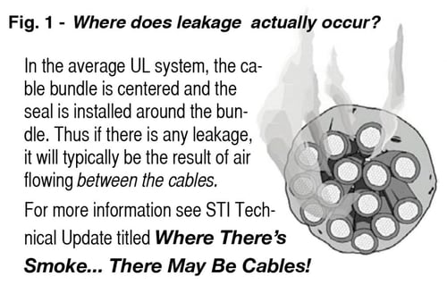 Leakage occurs within the cable bundle and not around it. Consider the typical cable installation depicted in a UL Through-Penetration System. The cable bundle is centered and the seal (be it putty, sealant, or foam muffins) is installed around it. These materials are not typically porous. This means that if there is leakage occurring, the air is flowing between the cables