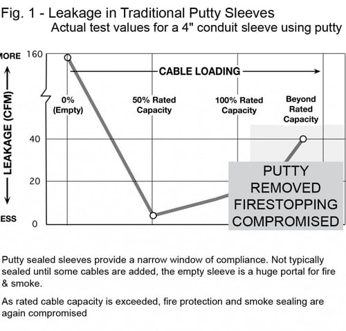 The effectiveness of traditional cable sleeve firestopping methods can’t be quantified. By code, through penetrations fall into a category referred to as unprotected openings. The codes place limits on the amount of unsealed space there may be in floors and walls. In theory, unprotected openings must be considered in this equation. This is expressed as Total Leakage Area. By rights, all cable penetrations should be considered in this calculation. The question becomes…How would you do it?