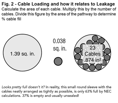 Another factor that contributes to this problem is the fact that round cables do not load very efficiently into round sleeves. Fig. 2 illustrates this problem. Anywhere from 35% to 50% of the space occupied by the cable bundles may be unsealed interstitial space. Firestopping requires additional space. Thus the actual cable loading may be reduced even further.