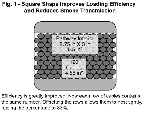 The EZ-Path® has a square shape which means far greater cable loading efficiency and lower smoke transmission. We discussed earlier the fact that round cables and round pathways when it comes to effective cable loading. EZ-Path® is square and that in itself is an improvement. Depending on the size of the cable, EZ-Path® can provide a cross sectional loading efficiency of up to 85% (compared to 50 to 65% for round sleeves). What accounts for the improvement? The square shape allows cables to nest better than the round shape (See Fig. 1). But just being square is not the complete secret to its success.