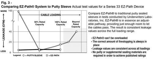 EZ-Path® has demonstrated consistently excellent smoke sealing results. In extensive testing conducted by Underwriters Laboratories, Inc., EZ-Path® has produced results, comparable to or even better in fact, than carefully installed putty systems (See Fig. 3). Unlike other sleeve products with integrated firestopping that optionally use